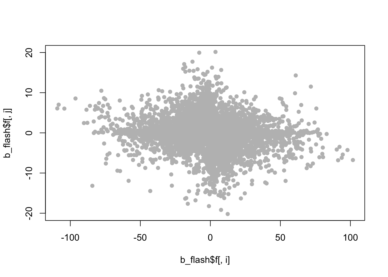 plot(b_flash$f[,i],b_flash$f[,j],col = "grey",pch = 16)